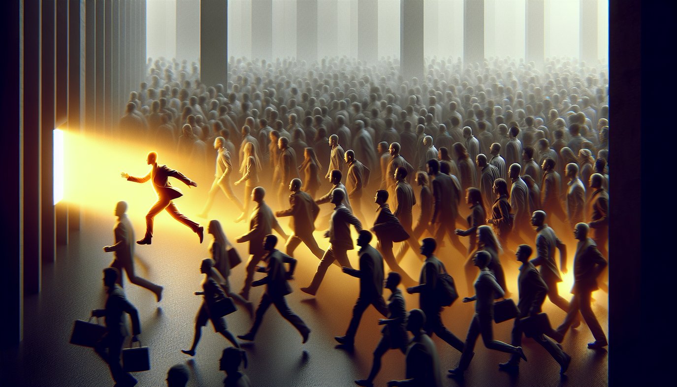 This is what social psychologists call pluralistic ignorance — a phenomenon where everyone privately feels alarmed but publicly acts calm, because they’re taking their cues from everyone else’s calm exterior. You look around. Nobody’s panicking. So maybe it’s not that bad? Each person suppresses their own alarm in response to the group’s apparent composure — composure that is itself a mask.