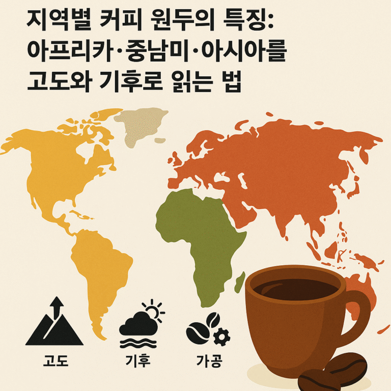 지역별 커피 원두의 특징: 아프리카·중남미·아시아를 고도와 기후로 읽는 법 지역별 커피 원두의 특징을 고도·기후·토양·가공이라는 프레임으로 정리한 중급자용 가이드입니다. 아프리카·중남미·아시아 원두의 맛 차이와 산미 조절, 취향별 원두 선택법까지 한 번에 살펴보겠습니다. 💡 KEY INSIGHT 국기·국가명보다 먼저 고도, 기후, 토양, 가공 방식을…